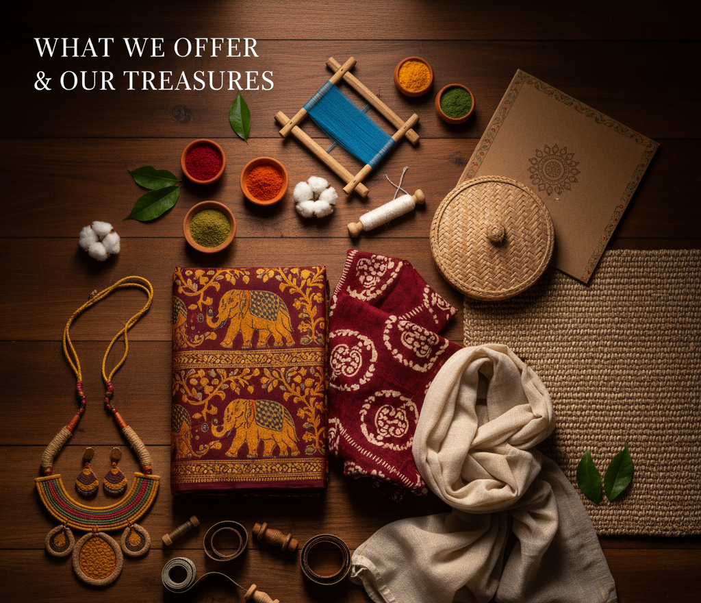 - Empowerment: Each product is lovingly created by women-led self-help groups and artisan communities. We believe in fair wages and dignity for the hands that weave our heritage.