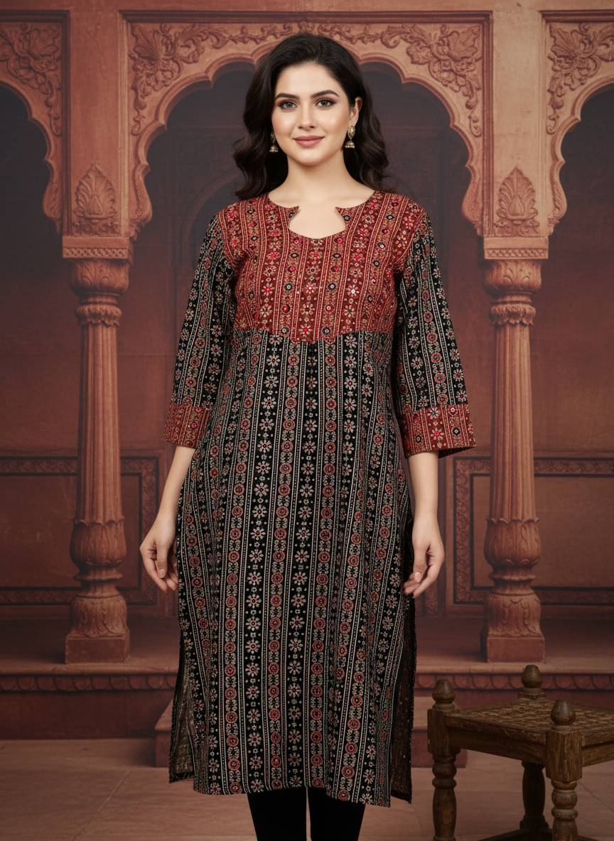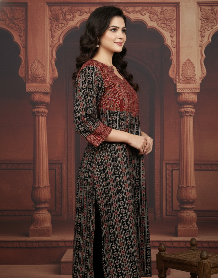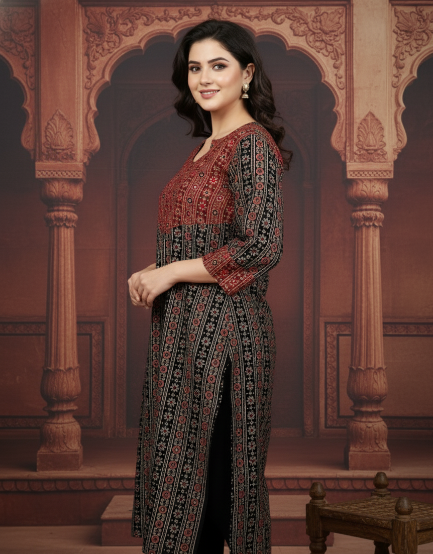- Ajrakh Block Printing: The primary print features the complex, geometric beauty of authentic Ajrakh block printing—a specialized craft traditionally practiced in Gujarat and Rajasthan. This variant showcases a sophisticated palette of deep black and rich maroon/red. The intricate repeating patterns are achieved through a lengthy, multi-step process involving natural dyes and resistance printing techniques. This method, passed down through generations, ensures that each motif tells a timeless cultural story. The precision of the Ajrakh technique gives the Ajrakh Kurti its striking, sophisticated visual appeal.