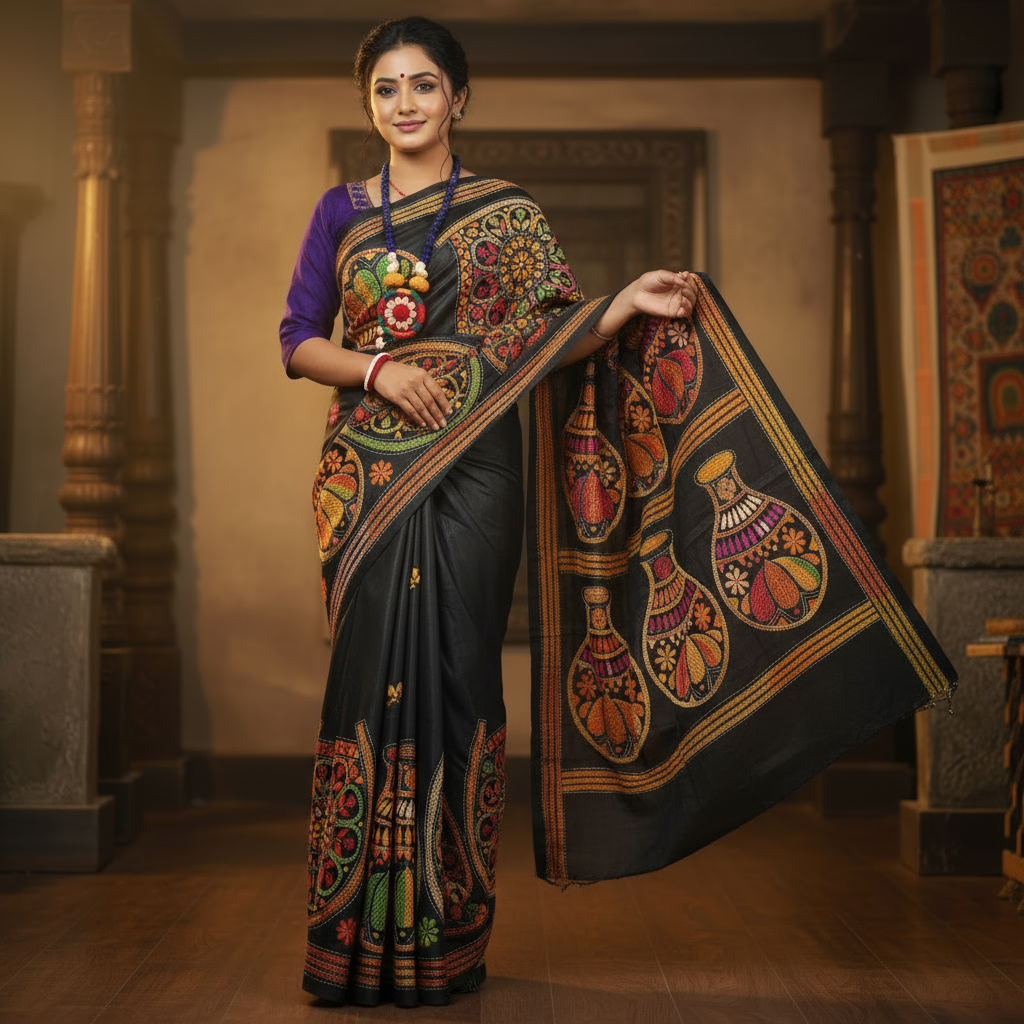 A Celebration of Heritage: Black Bangalore Silk Kantha Saree