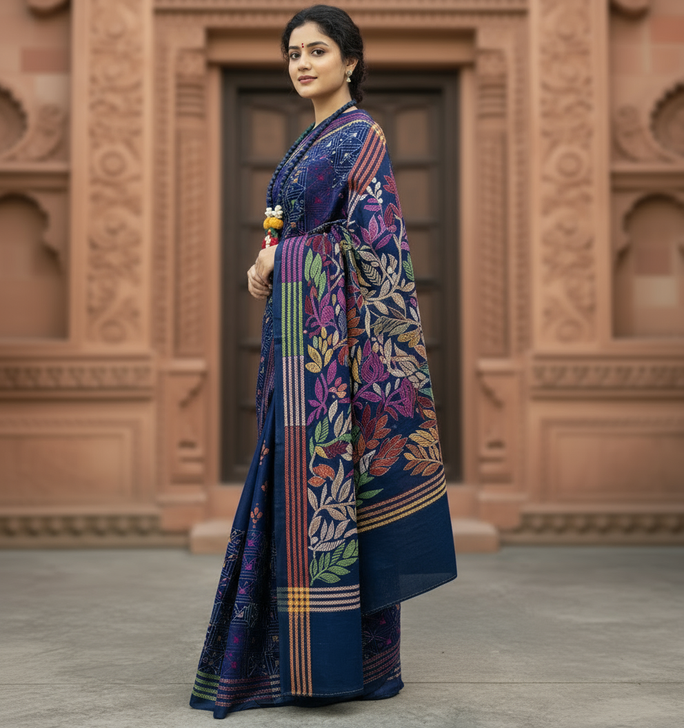 This piece showcases intricate multicolour Kantha embroidery. The design is a sophisticated blend: the border is modernly designed with bold, contemporary patterns, while the body and pallu bear the cherished traditional motifs of Kantha. This fusion makes it highly versatile, perfect for those who appreciate heritage craft with a forward-looking aesthetic.