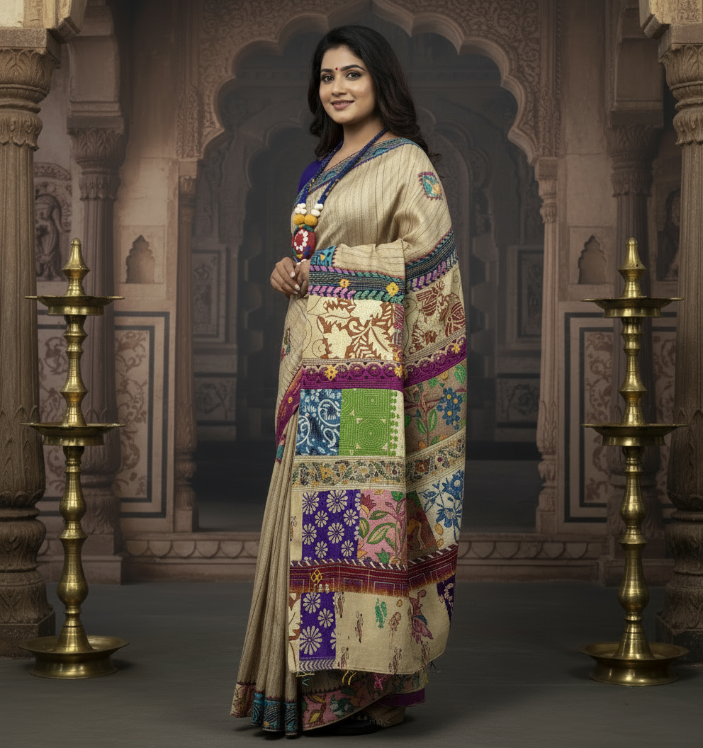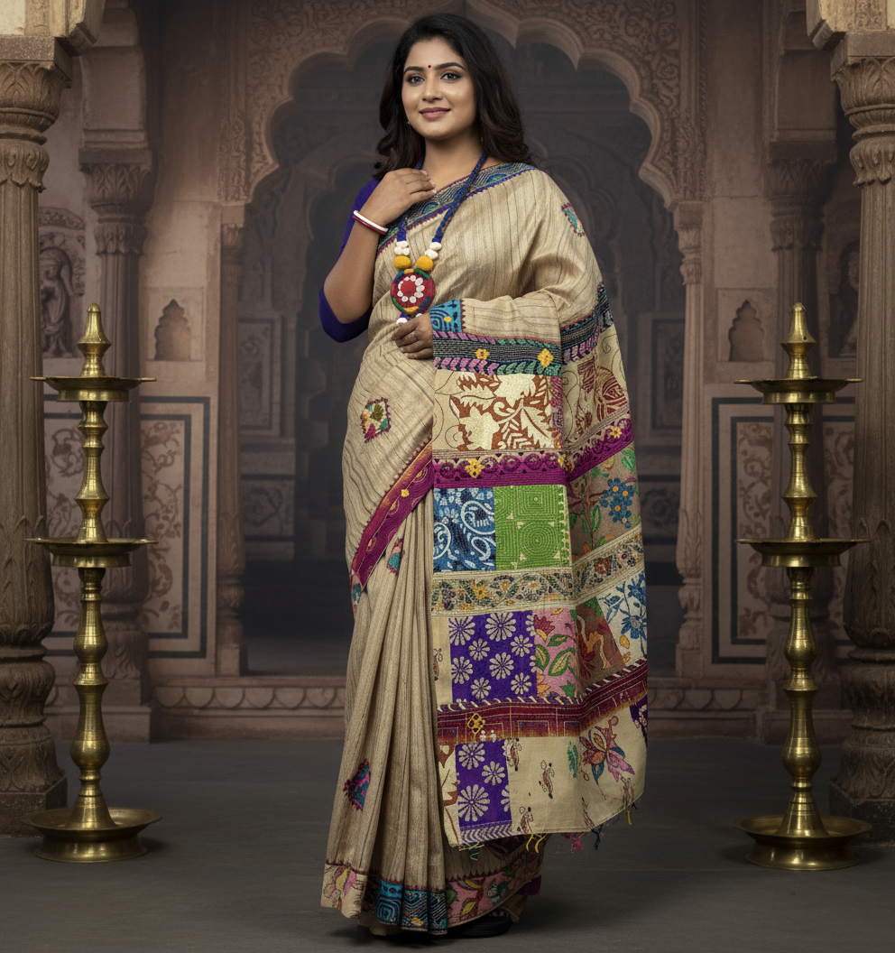 Ghicha Tussar Saree with Multi-Colour Appliqué and Kantha Stitch