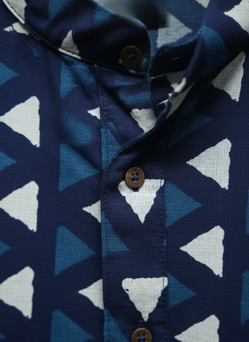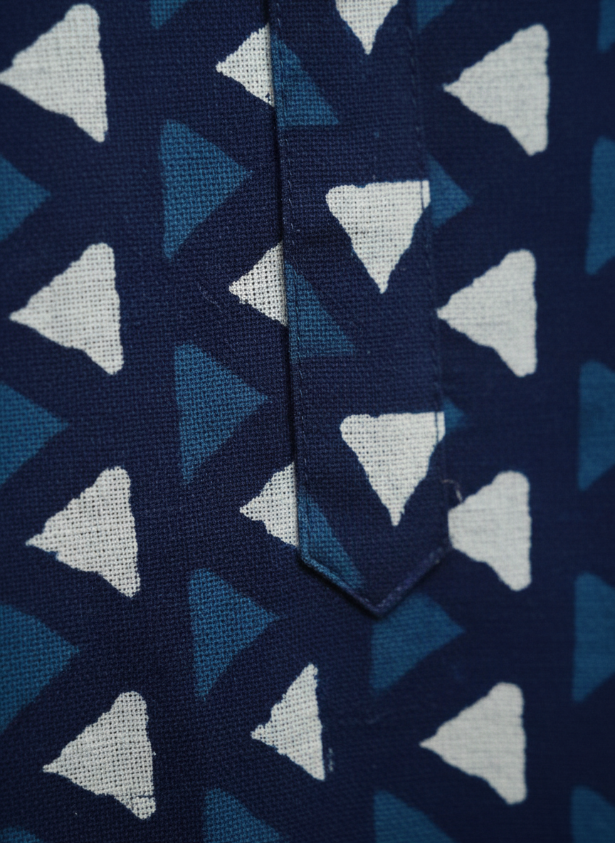 The garment features a striking, all-over Geometric Print composed of repeating triangles in contrasting shades of dark and light indigo. This pattern is achieved through Hand Block Printing, a meticulous craft where the artisan stamps the motif onto the fabric by hand. The pattern offers a contemporary, graphic appeal, proving that heritage meets contemporary fashion beautifully. This Indigo Full Punjabi Geometric Print is perfect for cultural events, festivals, or sophisticated casual gatherings.