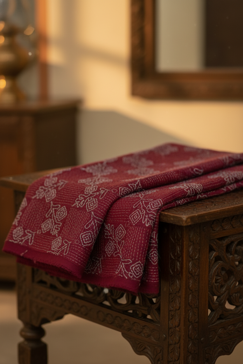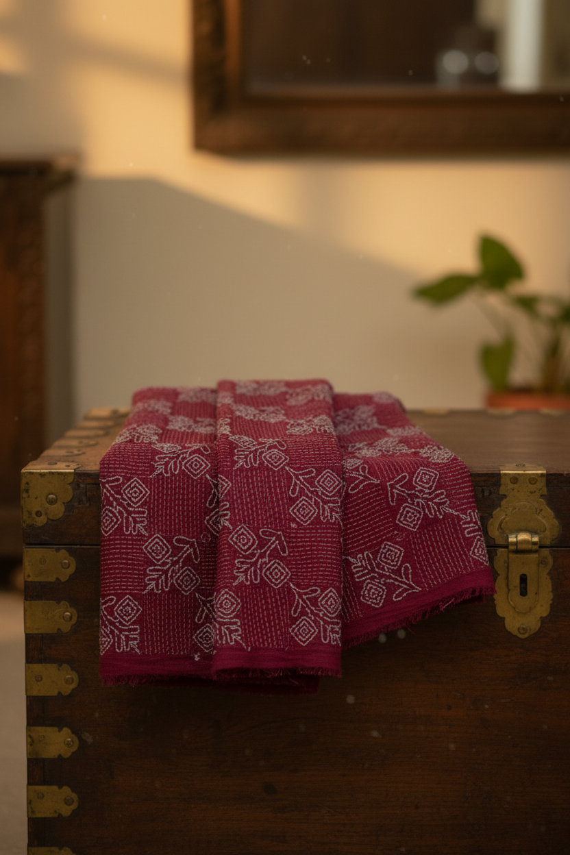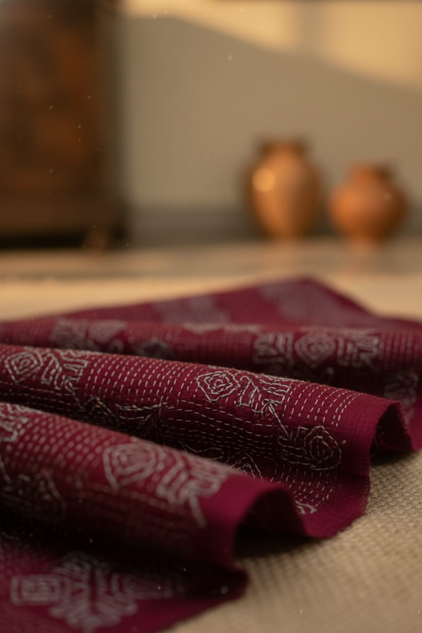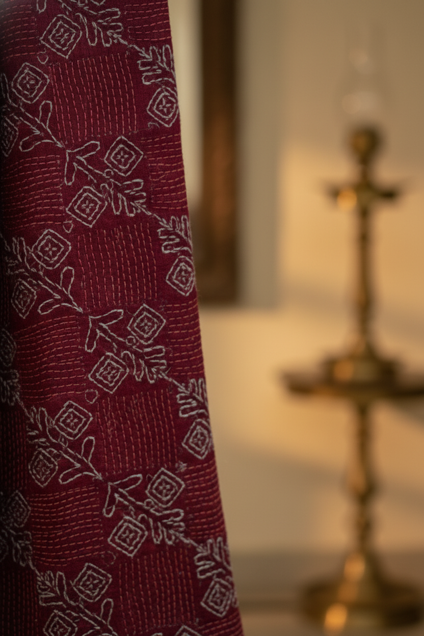 Elevate your ensemble with this rich maroon Block Kantha Dupatta. Featuring delicate Kantha hand embroidery over a traditional block print base, it’s a testament to heritage craftsmanship. Rooted in Tradition, Woven with Purpose.