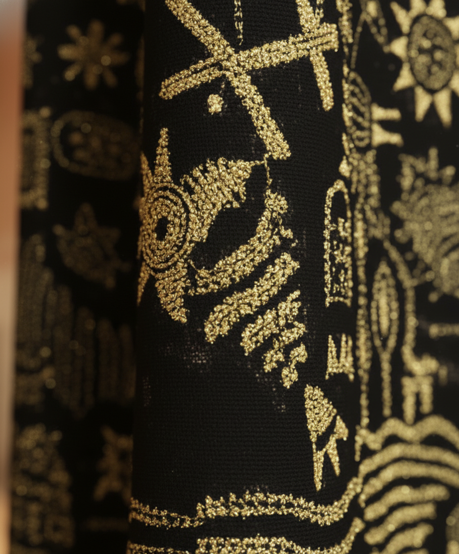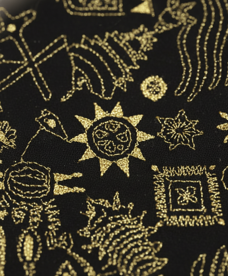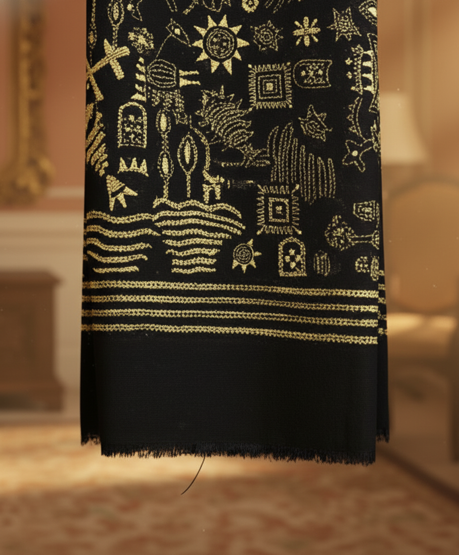This dupatta is a true wearable canvas, celebrating the rich narrative tradition of Folk Art Kantha. The embroidery features dense, all-over motifs, including figurative elements, stylized flora, fauna, and geometric symbols. The gold-coloured thread contrasts dramatically with the dark (likely black or navy) cotton base, making the storytelling elements visually striking. The meticulous Kantha stitch, a specialty of Bengal’s artisans, showcases their dedication to preserving India’s craft traditions. This stunning Cotton Dupatta Folk Kantha Embroidery truly is a testament to ethical, narrative art.