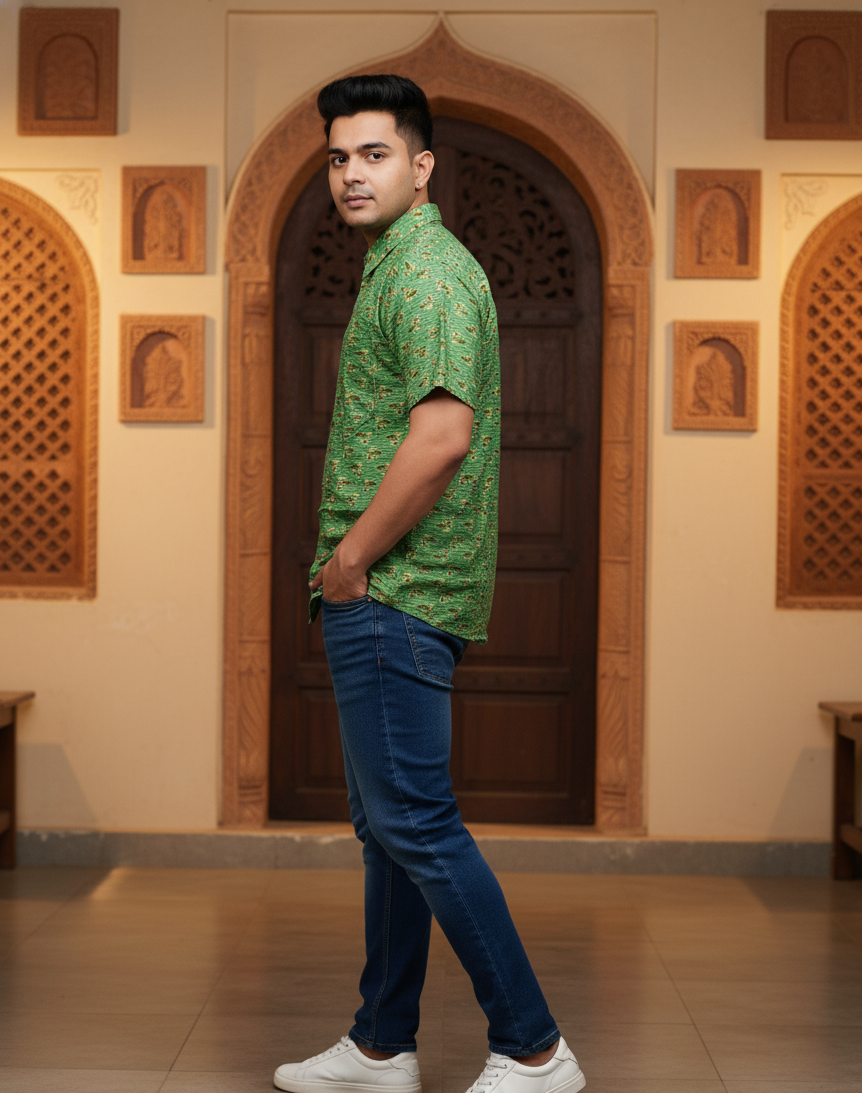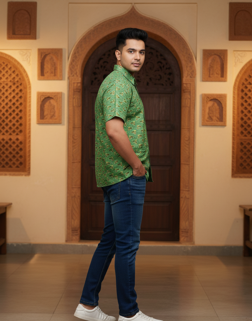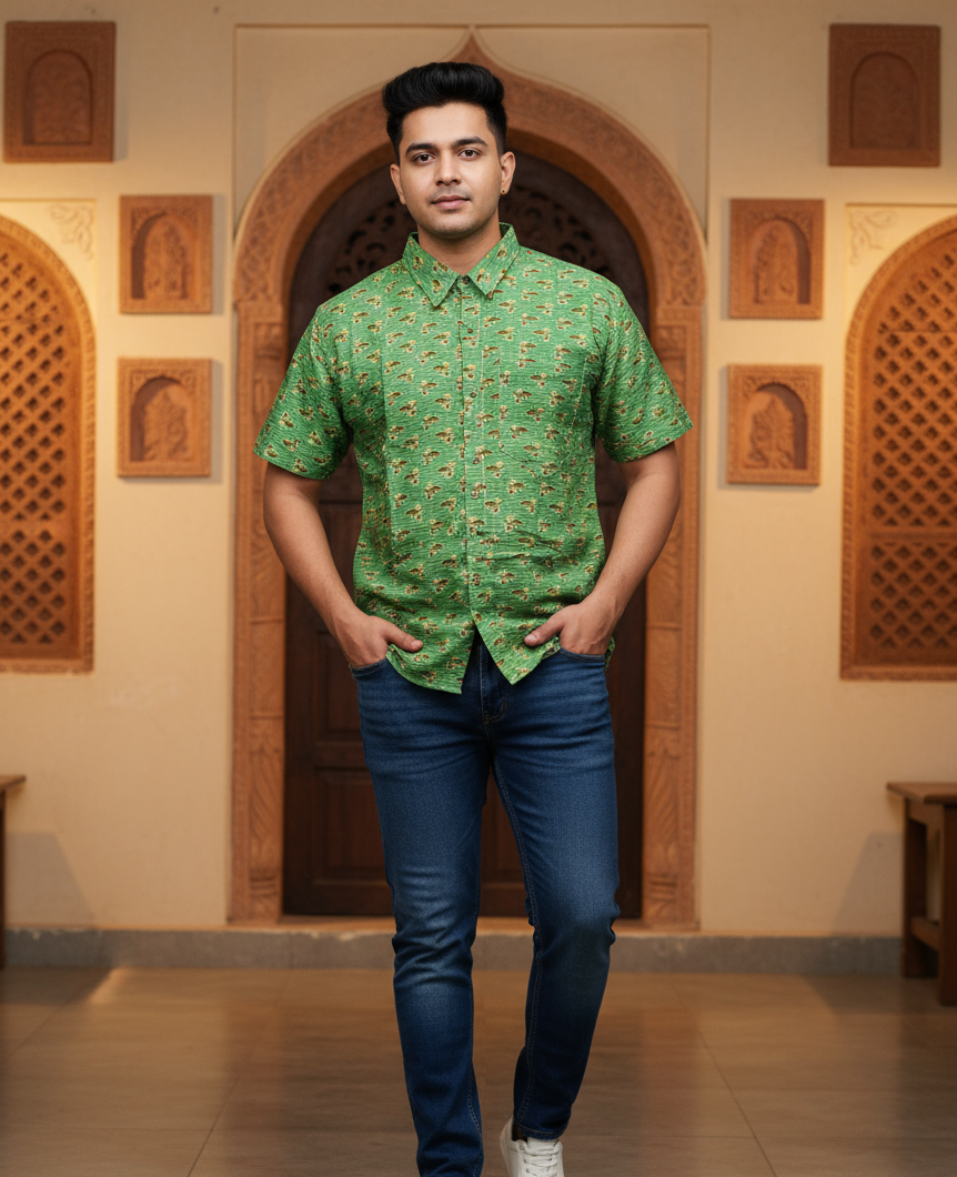 Step into tradition with this Green Ajrakh Short Shirt from Lokayan – Handicraft Heritage. This piece is a celebration of centuries-old artistry from Kutch, Gujarat, masterfully reimagined for the contemporary man. It is not just apparel—it’s a story you wear.