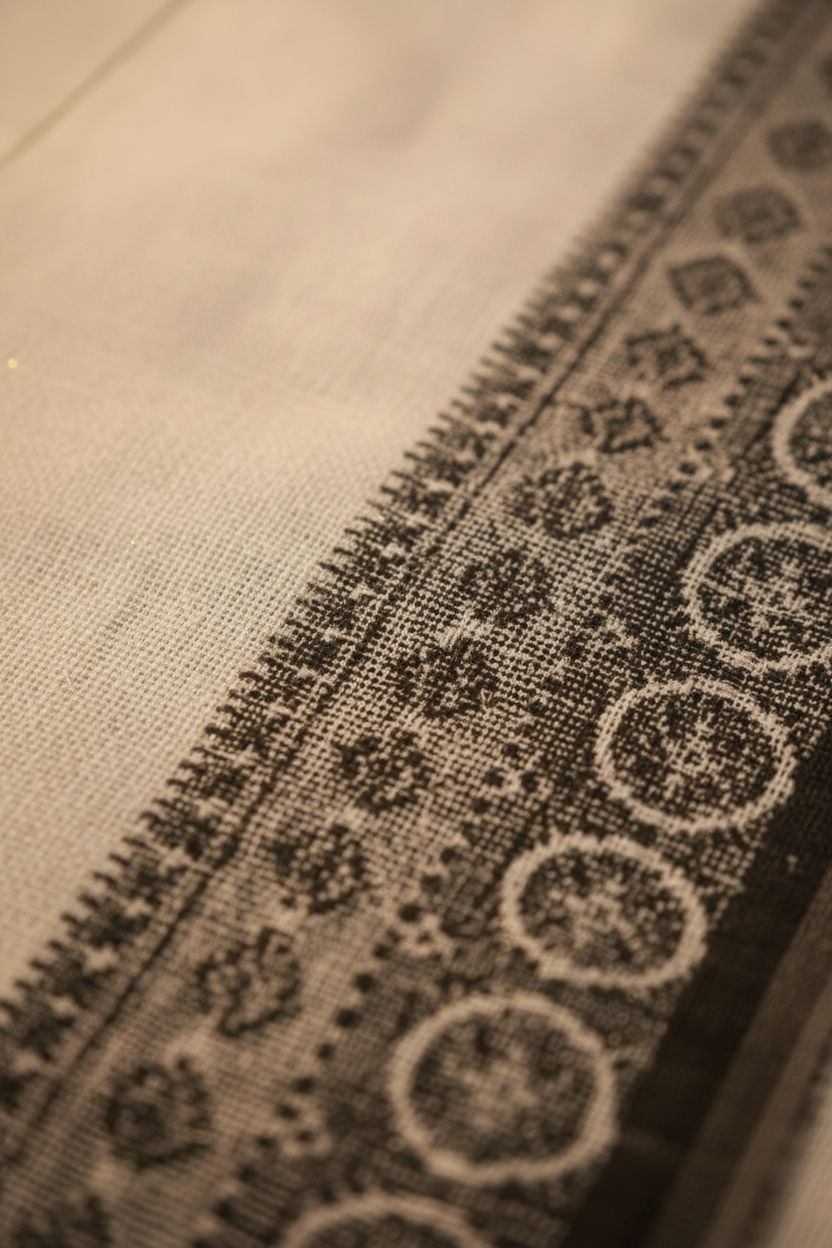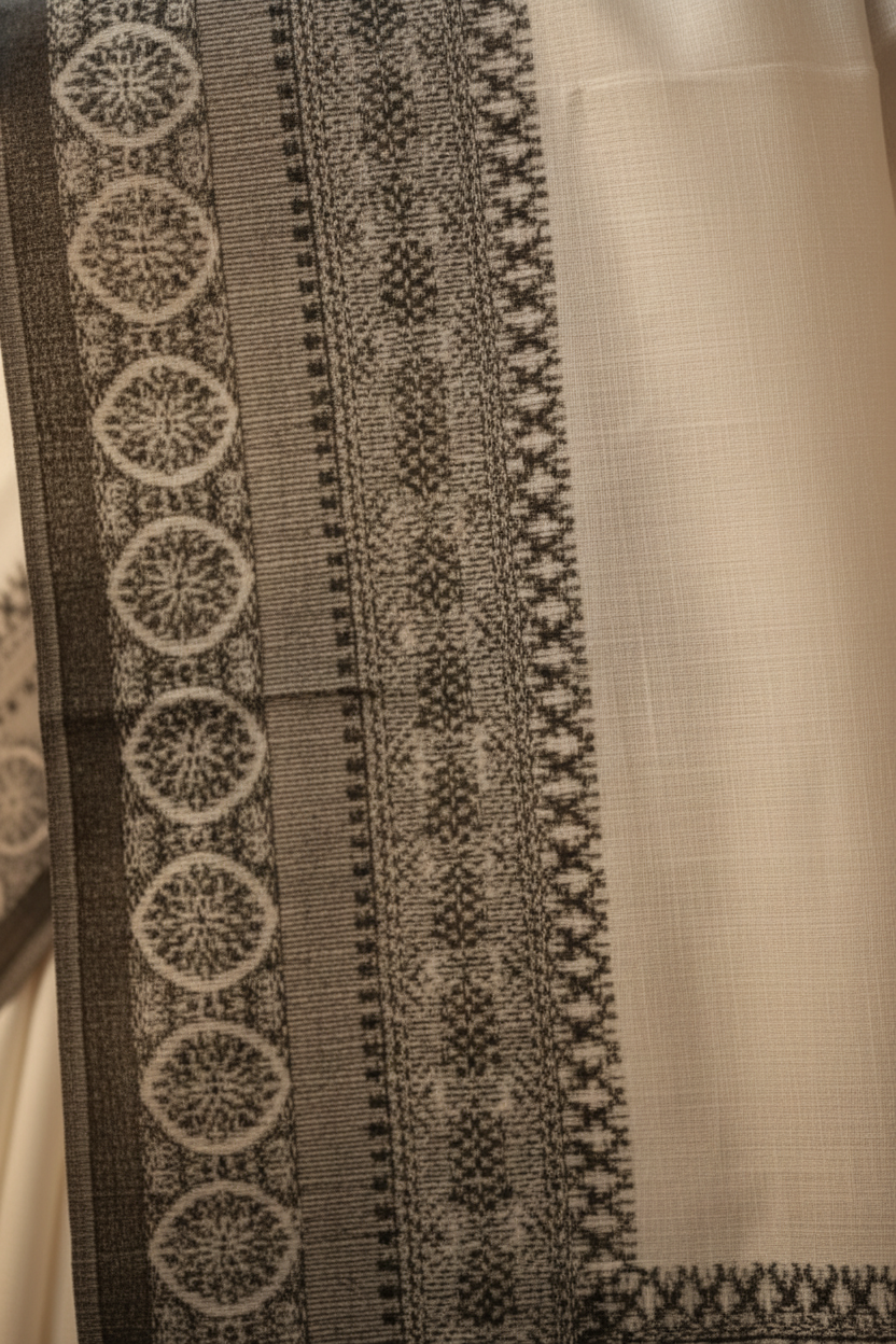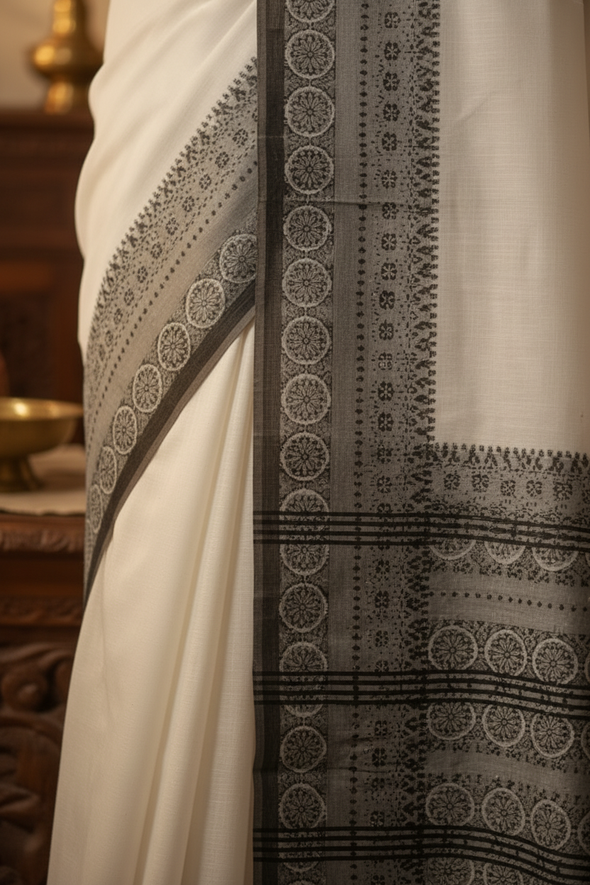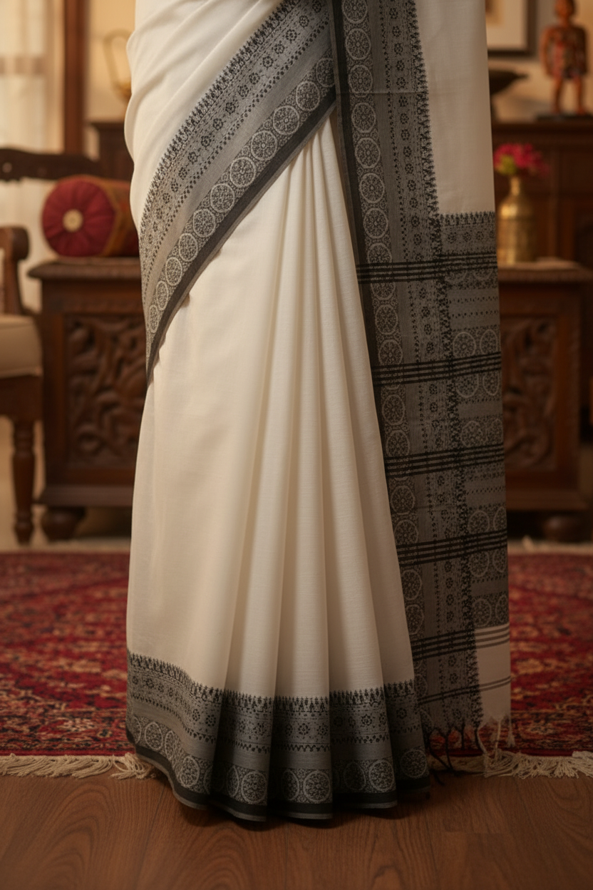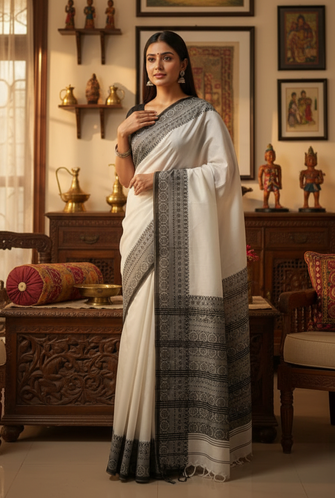 This saree is crafted using the Begumpuri weave, a celebrated textile tradition originating from the Begumpur region of West Bengal. Known for its durable, finely woven structure and airy comfort, this fabric offers a unique combination of crispness and a lightweight drape. The signature look is achieved through the close geometric and temple-style motifs seen along the broad pallu and border. This White Begumpuri Saree Black Border embodies the essence of this traditional craftsmanship.