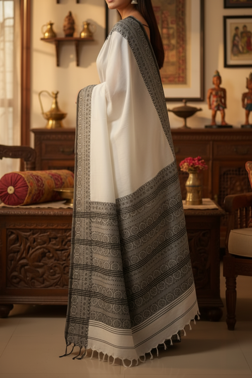 Step into authentic heritage and timeless elegance with this exquisite White Begumpuri Saree Black Border from Lokayan – Handicraft Heritage. This gorgeous saree is a commitment to Artistry and Heritage, blending the soft, fine weave of Begumpuri with an iconic color combination.