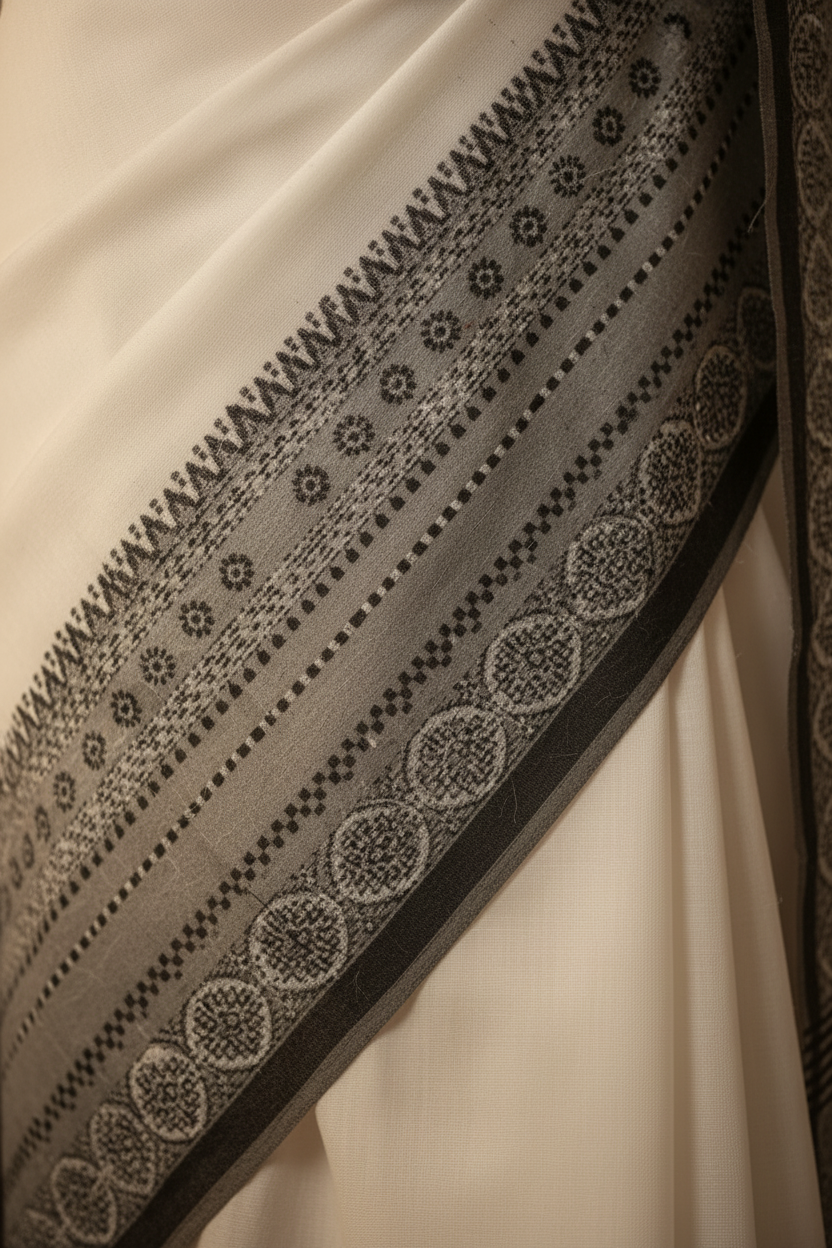 The stunning White base of this saree provides a serene, sophisticated canvas, making it versatile for any occasion, from corporate events to cultural gatherings. The white is brilliantly contrasted by the traditional Black Border and pallu detailing. This classic combination of black and white adds depth and structure to the overall drape. This simple contrast ensures the saree is lightweight, graceful, and versatile, appealing directly to those who value understated sophistication. This White Begumpuri Saree Black Border truly is a magnificent example of how traditional techniques create garments perfect for contemporary fashion.