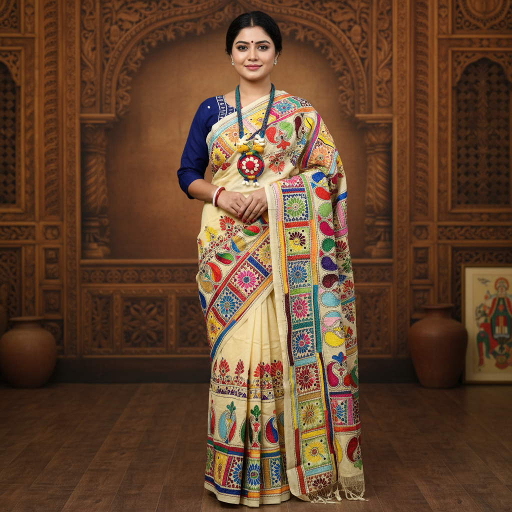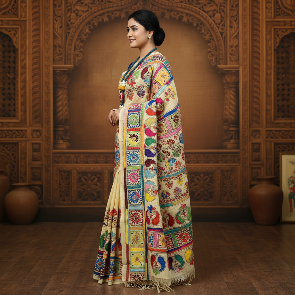 A Masterpiece of Storytelling: Pure Tussar Multicolour Kantha Saree