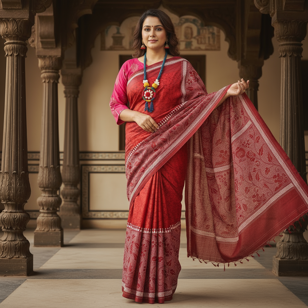 This elegant silk saree is elevated by the intricate needlework of Reverse Kantha work. This specialized hand stitch is applied meticulously over the broad border and the pallu. The combination of the wax-resist Batik technique and the delicate Kantha hand stitch makes this piece truly unique, requiring immense skill and patience from the artisan. Each piece is a testament to the dedication of women who bring heritage to life through their hands.