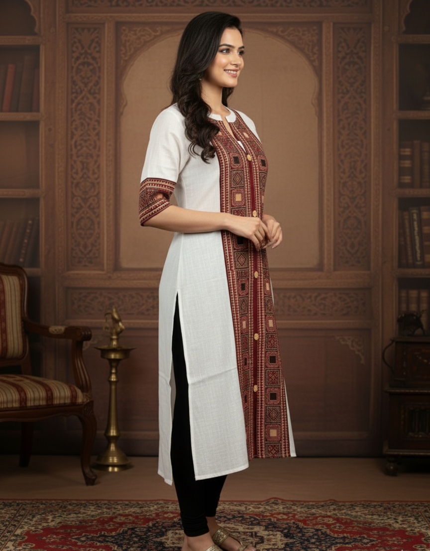 - Ajrakh Block Printing: The central Aplique panel, along with the borders of the 3/4th sleeves, is detailed with AUTHENTIC Ajrakh block prints, featuring traditional geometric patterns in rich, deep maroon and black hues. This combination provides a powerful visual contrast against the crisp white cotton base.
